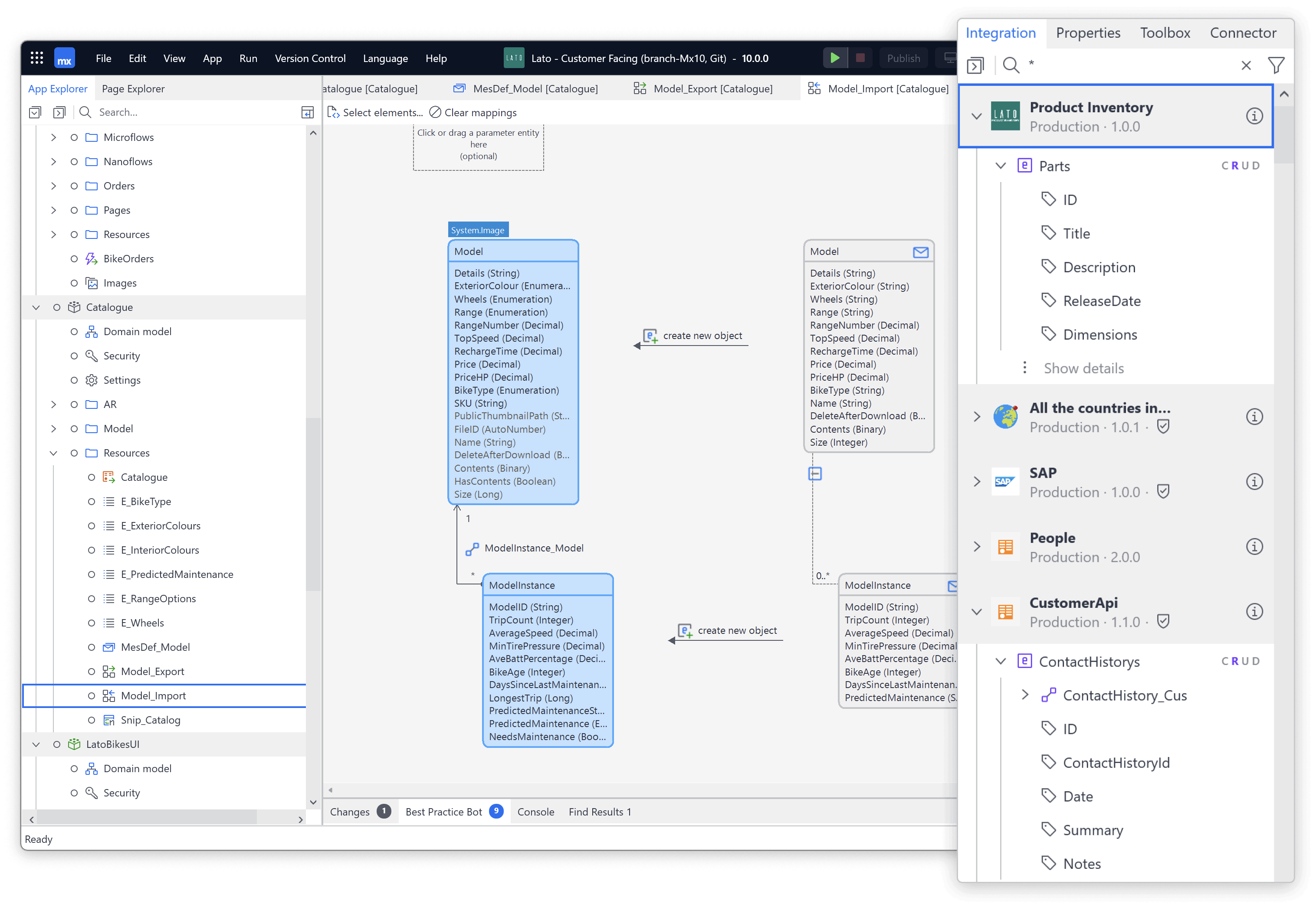 During design/development time, they can be modeled within the IDE (like local data) after being dragged and dropped from the Mendix Connect Catalog Pane. During runtime, External Entities automatically make the appropriate OData calls to the external system in order to read and write.