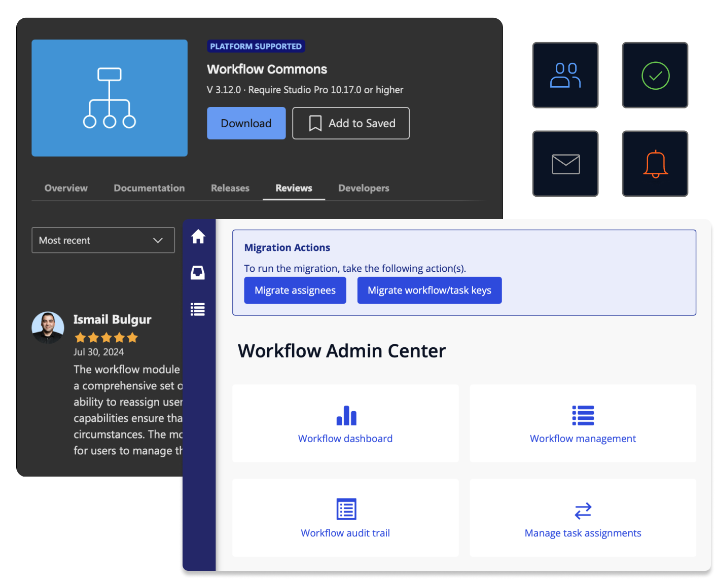 - Reduce development time and effort with pre-built templates and reusable components from Mendix Workflow Commons.