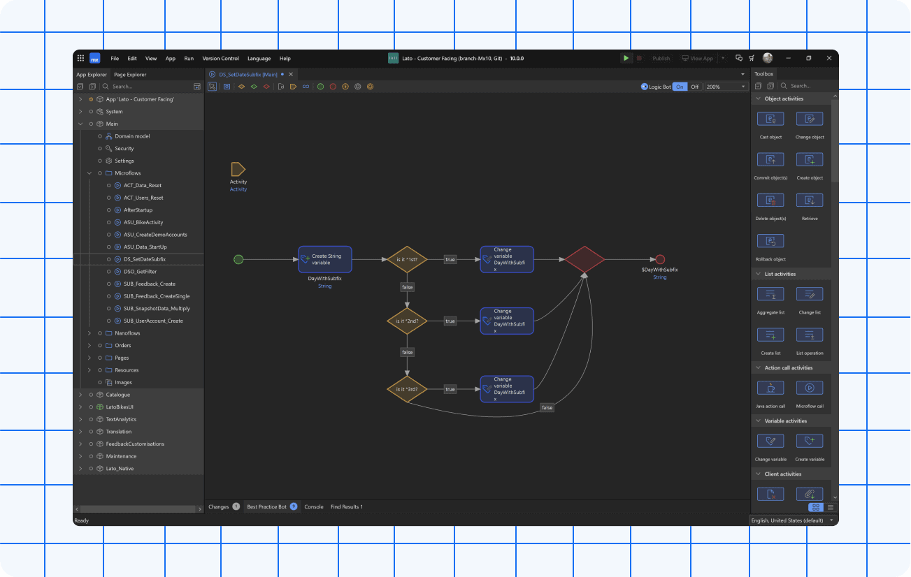 The AI-powered Mendix IDE, Studio Pro, is built to boost your productivity. It automates repetitive tasks, and helps you handle complex tasks with ease, so you can focus on building, not boilerplate.