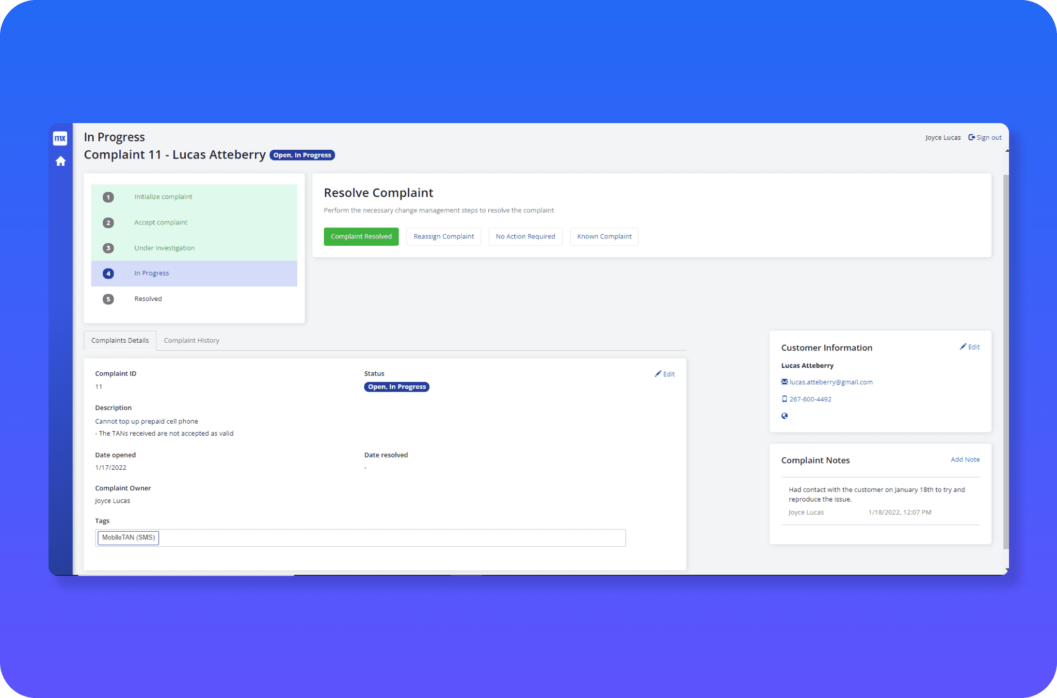 Mendix Compliance Complaint Tracker provides your institution with a modern application to streamline your customer complaint resolution process. This directly results in reducing significant FTE hours and eliminating the burden of future audits.