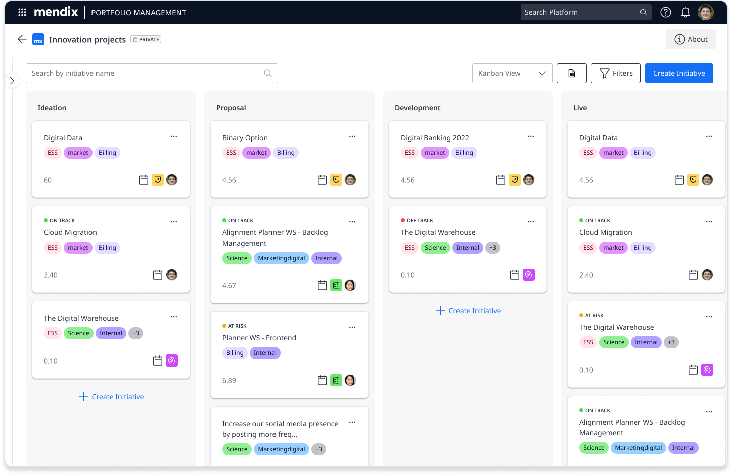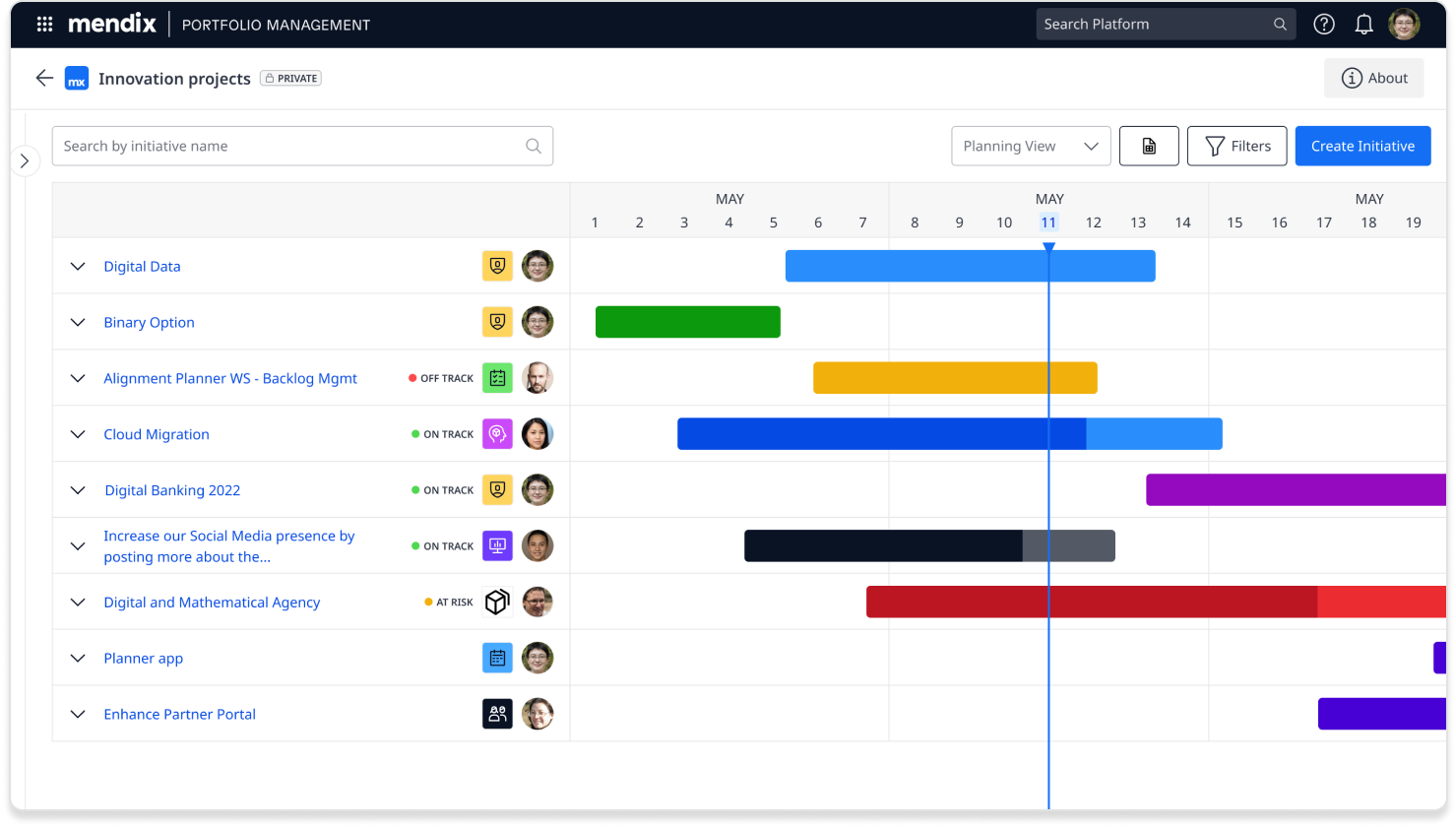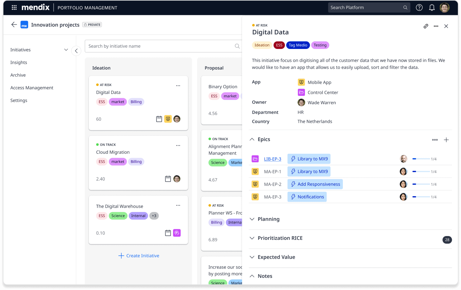 Another reason why portfolio management is important is the visibility and transparency it creates. A centralized portfolio management tool like Mendix Portfolio Management gives businesses a clear, complete view of all initiatives at every stage of the process. The tool allows customers to plan their company portfolio, visualize initiatives, track progress, and prioritize initiatives. This helps you find the best areas of focus for digital transformation.
