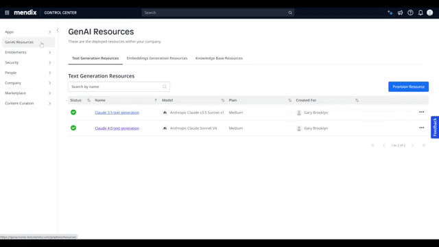 Until now, accessing GenAI resource packs required contacting Mendix. That’s changed. Mendix admins can now provision text generation, embeddings, and knowledge base resources directly through Control Center using Cloud tokens: all self-service. Choose from small, medium, and large plan sizes across leading models including Anthropic Claude Sonnet (v3 and v4) and Cohere Embed. And in case you’d want to scale down, simply schedule resource deprovisioning for the end of your subscription month in Control Center, too.