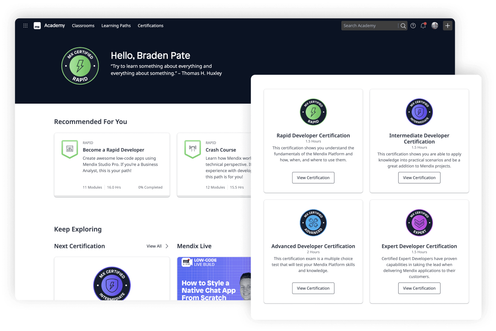 The Mendix Developer Certification Program gives developers the opportunity to boost their expertise by becoming certified as a Rapid Developer, Intermediate Developer, Advanced Developer, or Expert Developer. Teams can also watch live or on-demand webinars that dive deep into topics like UX, REST integrations, mobile development, and more.