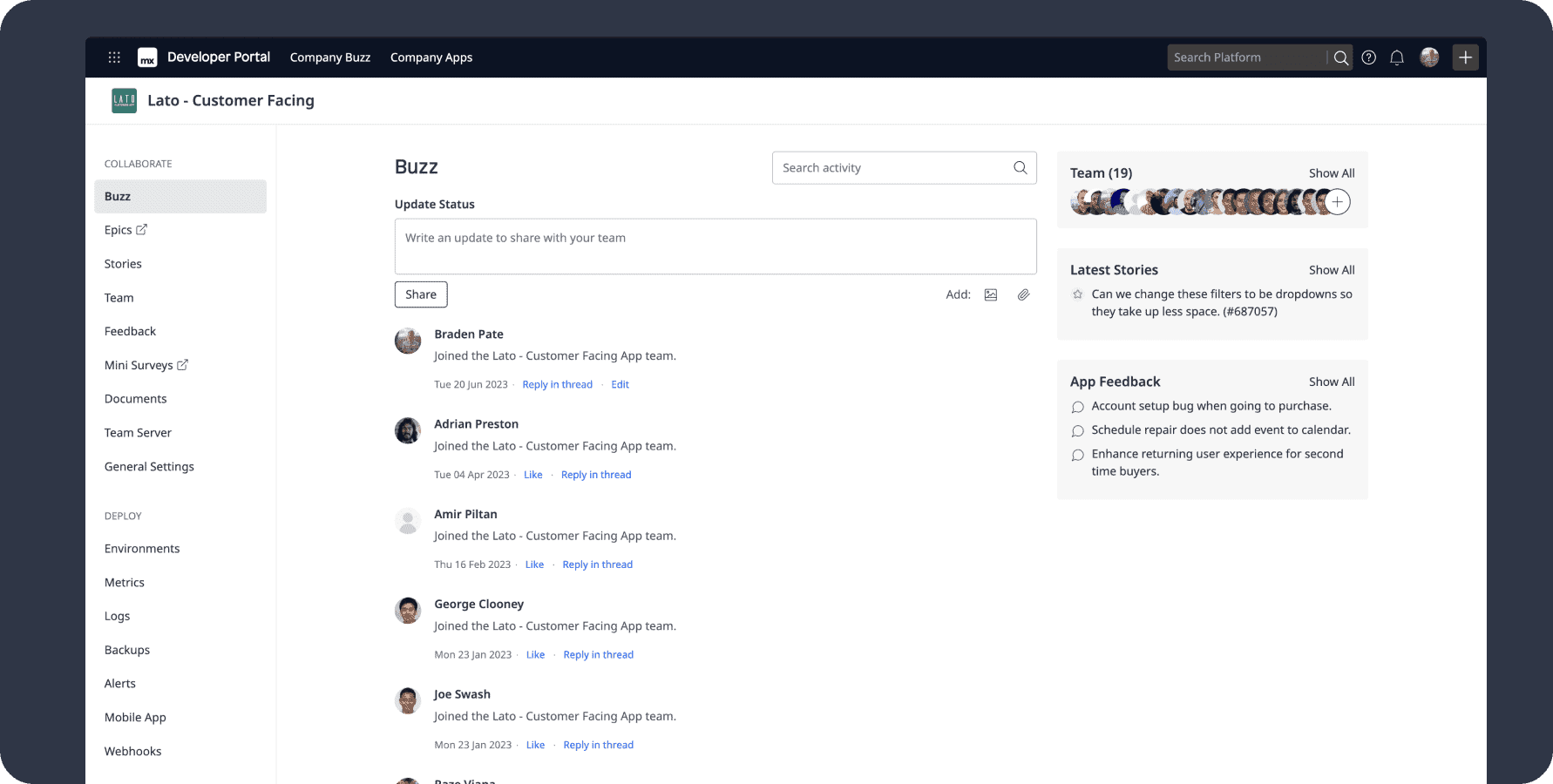 In the Mendix Portal, each application lives in its own central project space with tools for collaboration, Agile project management, backlog management, feedback management, and DevOps.