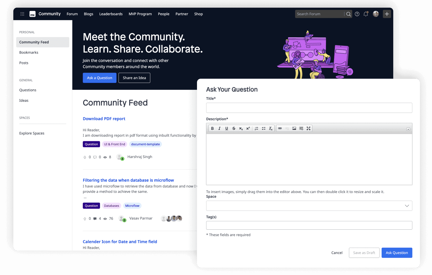 The Mendix Forum is where users can ask questions, get support, share ideas, and find the tools necessary to reach their application development goals. The forum is active 24/7, with most questions answered within 30 minutes.