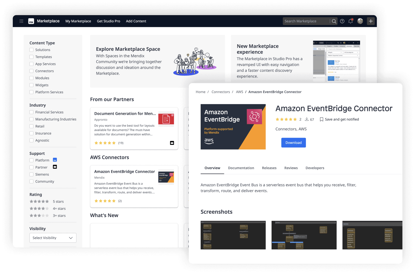 Mendix Marketplace contains a curated library of templates, connectors, modules, widgets, and other purpose-built components to help teams accelerate development. Developers can also upload components they’ve built and share with the Mendix community