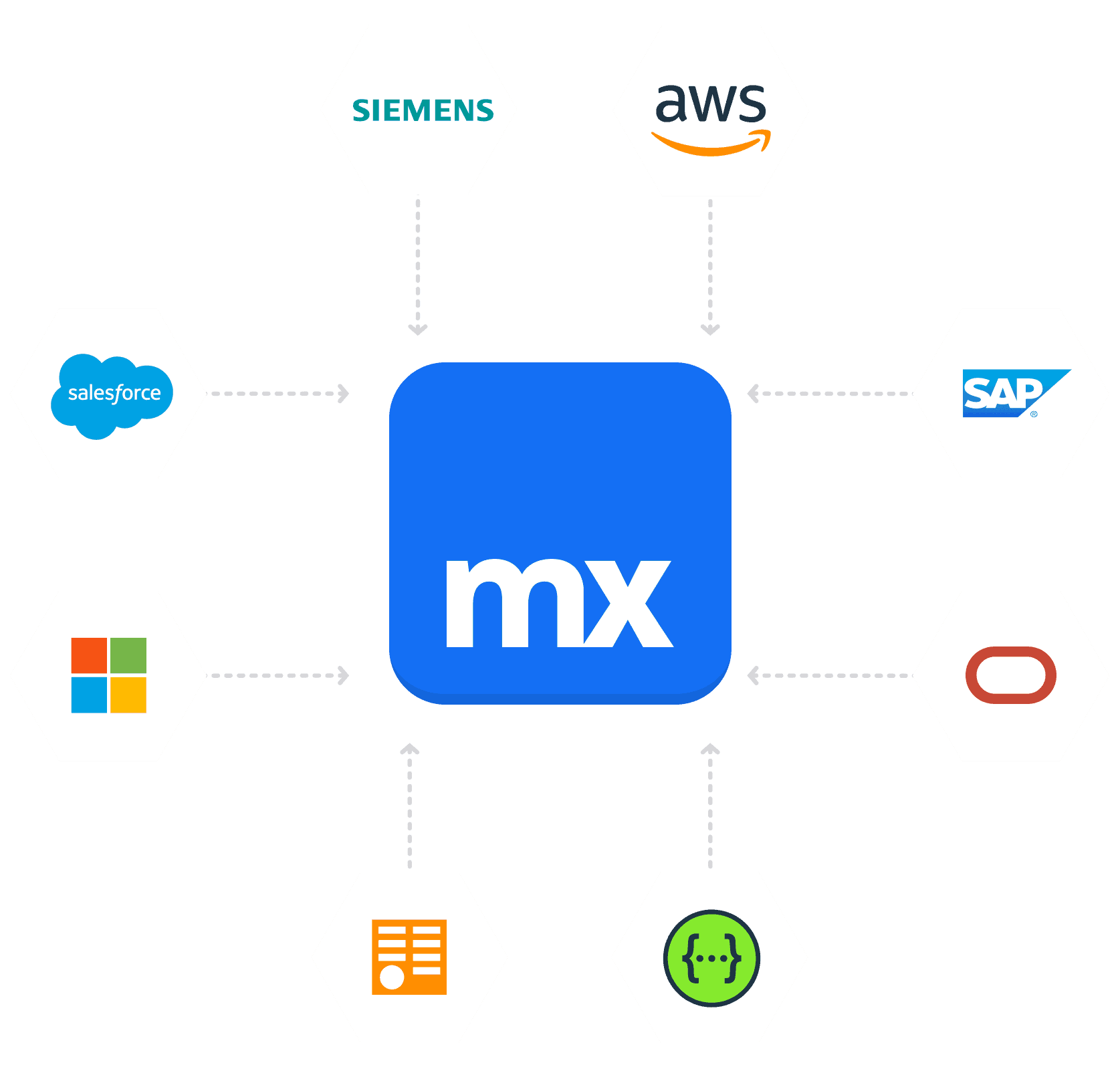 Mendix supports integrations with your existing data sources and services through industry-standard interfaces and protocols — REST, SOAP, MQTT, JDBC, BAPI, OPC, and OData — enabling developers to connect to systems like Oracle, Salesforce, MS Dynamics, SAP, AWS, and others.