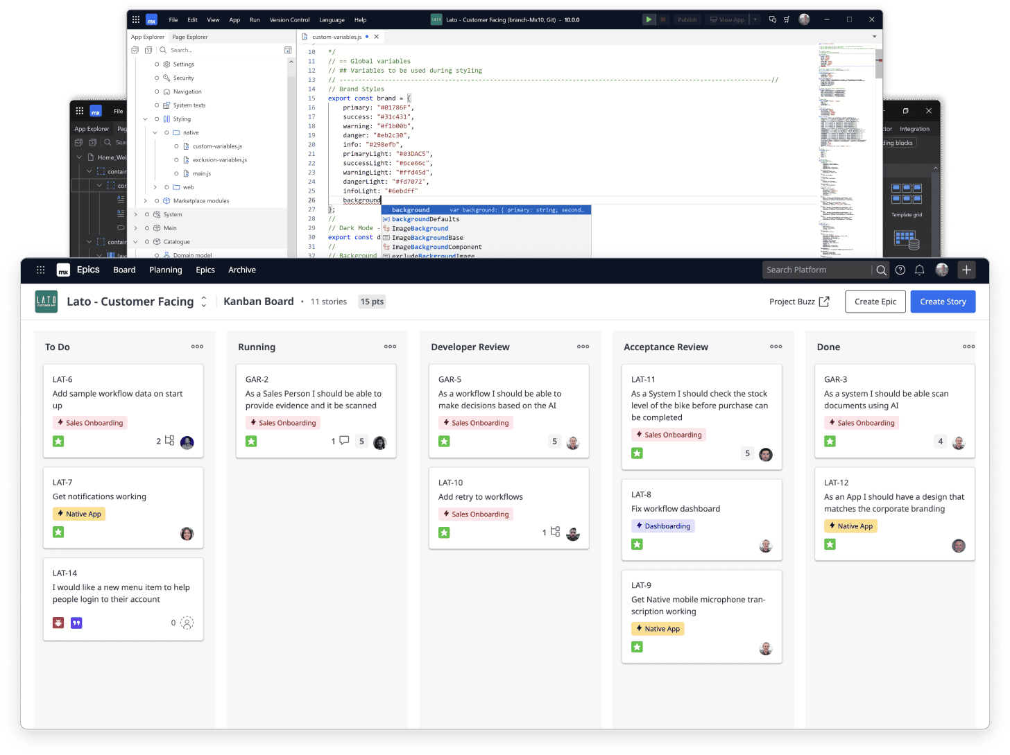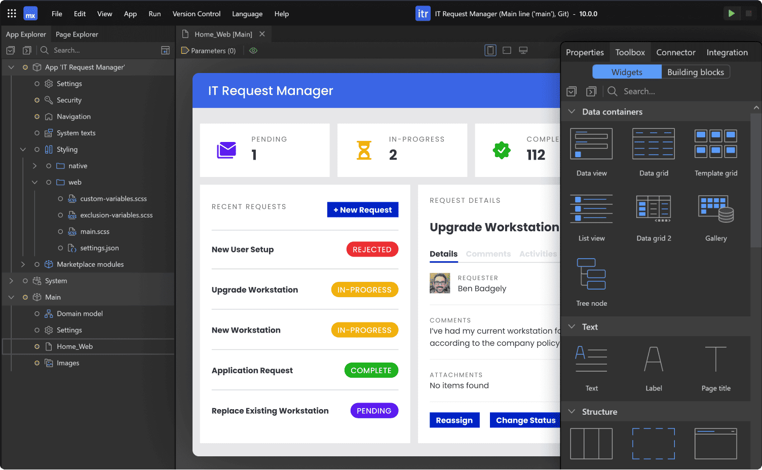 The Mendix low-code Platform is a model-driven IDE that abstracts the technical aspects of building an application—logic, data model, user interface, etc.—and presents them as visual drag-and-drop components.