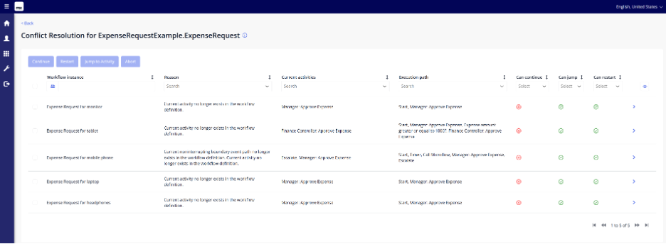 As part of the Workflow Commons module we have added a new Conflict Resolution feature. Due to the changes you make over time to your Workflow models, the actual corresponding (running) instances may become incompatible. Instead of resolving instances one by one, administrators can now manage multiple workflow instances directly in one go. This is done using an overview that allows for grouping conflicted instances based on factors such as: conflict reason, the current activities, and/or the execution path. The administrator can then choose a resolution action for the whole group, such as Continue, Jump to Activity, Restart, or Abort.