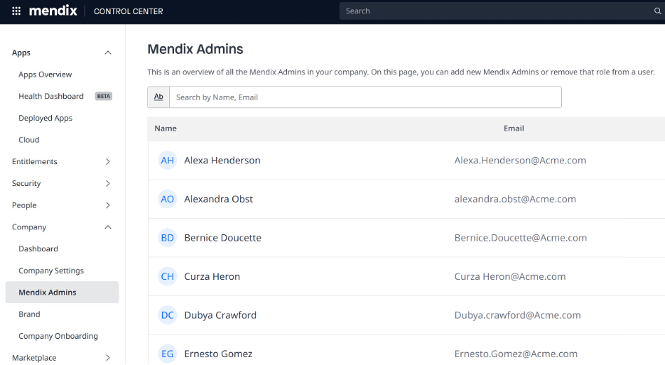 Some Mendix admins were unaware they could add and remove Mendix admins themselves, because you had to go through Company Settings to find the admin management page. So, we gave it a fresh new home! You’ll now find your company admins right in the Company section of Control Center.