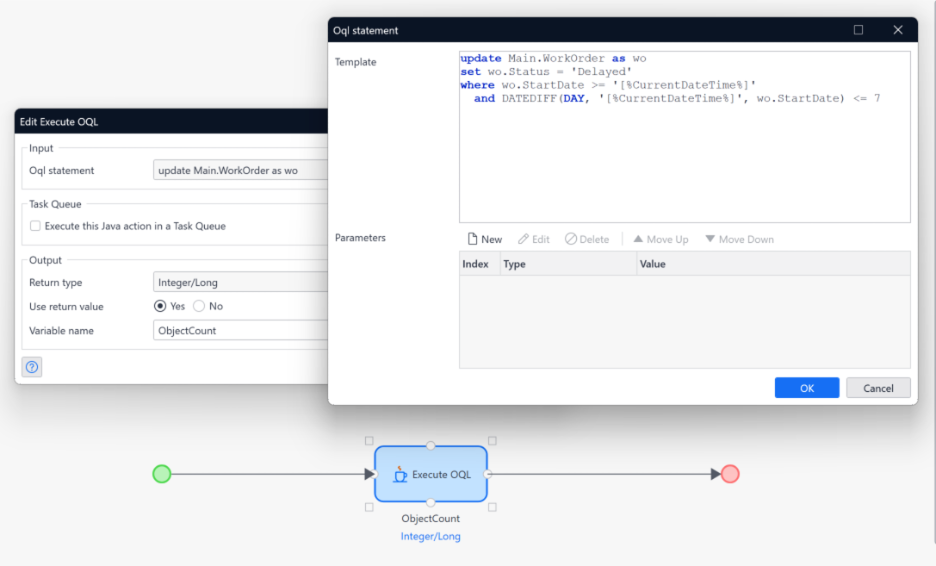 To improve performance when updating, deleting or inserting large number of objects, OQL is being extended with DELETE, UPDATE and INSERT functionality. This month’s release adds UPDATE support in OQL. Currently it is only available through a Java runtime API (learn more), Studio Pro modeling support will follow in the next months. The Java API enables you to handle bulk update using a custom Java Action as illustrated in the screenshot below. The OQL query finds all WorkOrders with a planned start date in the next week, and sets their status to Delayed.