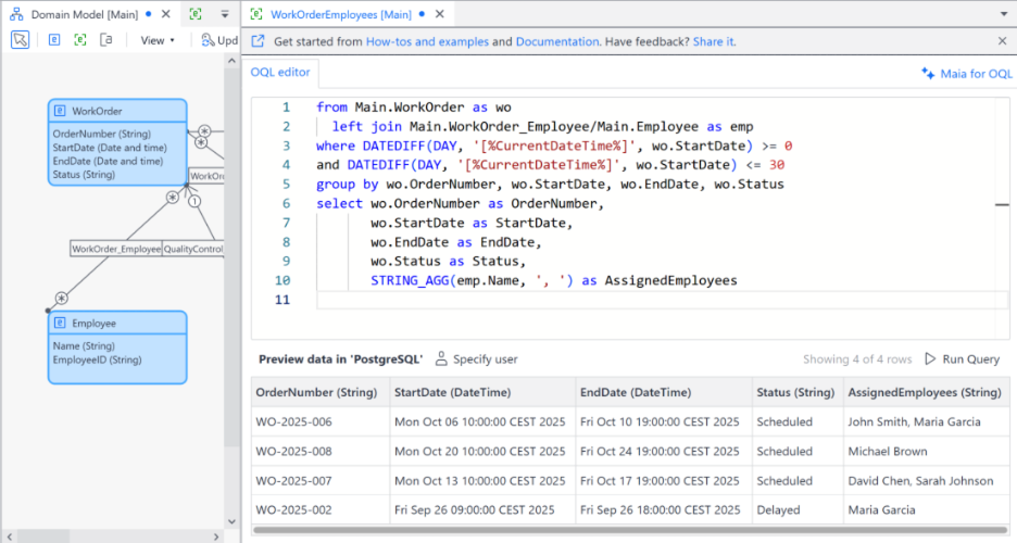 We’ve added support for STRING_AGG to OQL. This allows you to concatenate multiple strings from multiple objects into one string value. The example below returns one string AssignedEmployees for every work order listing all the employees working on the order.