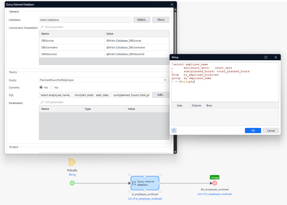 In the example below, the group by clause in the SQL query is extended by the $RollupBy microflow parameter. This is a common use case for drill down dashboard charts, where you first want to group by year, then by quarter, by month, and finally by week or day.